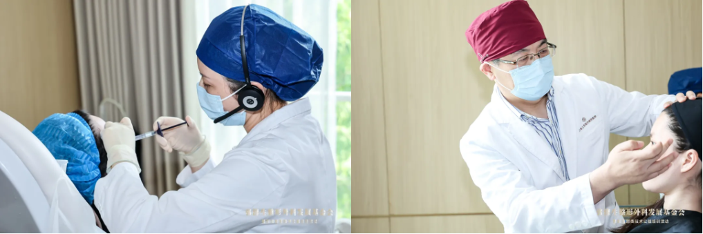 ▲上实医美余文捷医师(左)、方建蔺副院长(右)依次进行注射演示