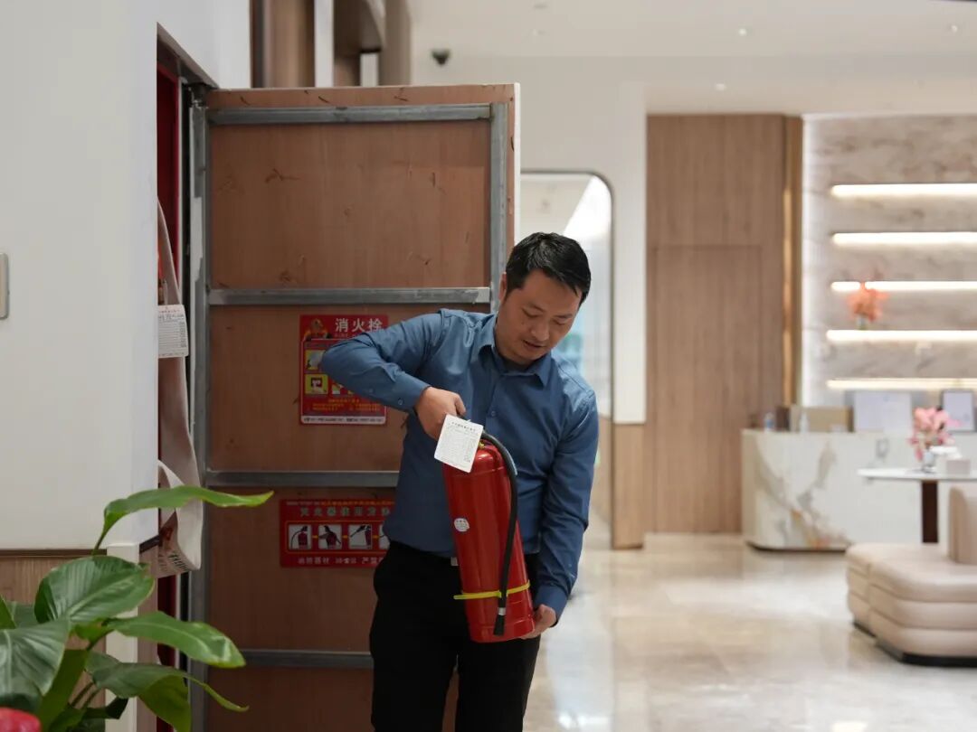 理论培训后,疏散演练有序开展。随着模拟火警信号响起,全体员工按照预设路线,弯腰低姿、捂住口鼻,从三楼培训室经疏散楼梯快速有序撤离至一楼大厅,整个过程紧张高效,仅用5分钟便完成全员安全集结。随后,进行消防器材使用演示,专业人员现场示范了灭火器 “提、拔、握、压”的操作步骤及消防水管“开、接、拉、喷” 的核心操作步骤,过程中特别强调,使用时需站在火势上风侧,与火源保持足够安全距离,从着火区域边缘逐步向中心推进灭火;同时提醒连接接口时需确认卡扣锁紧防漏水,铺设水带时避开尖锐物体防止破损。员工们踊跃参与实操,熟练掌握了水带拉出及精准喷射等关键使用方法。